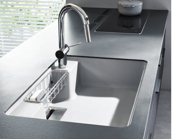 光沢感のある素材で、天板と一体成形にできるため継ぎ目が少なく、汚れや水垢がたまりにくいのが特徴です。